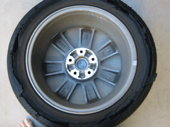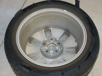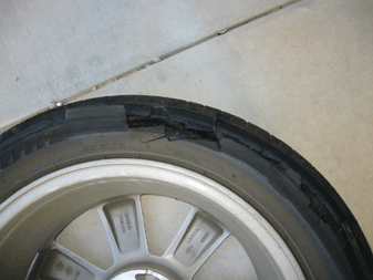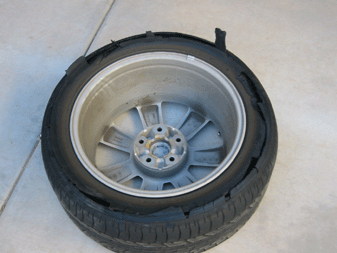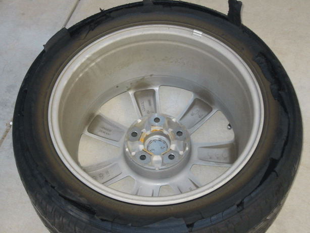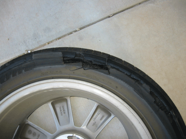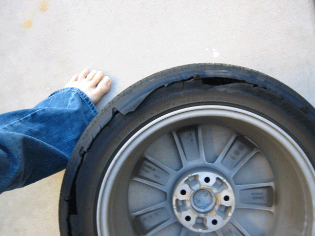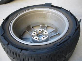 I started driving from my home to the freeway. Surface street driving was for about 5 miles at around 45 MPH. I was then on the freeway for about 5 miles at around 80 MPH. When the tire blew I was driving at about 75 MPH. I was in a light turn when I felt a strange vibration that felt like rough road. I began to slow down. The vibration became worse so I continued a controlled deceleration. I came to a complete stop after about a quarter mile and this is what I had left on my tires.